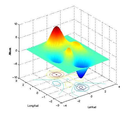 Figura 1. Topografía compleja (en perspectiva tri-dimensional) y curvas de nivel (plano inferior). Si medimos la temperatura en varios puntos y repetimos el procedimiento anterior, obtendremos un mapa de curvas de igual temperatura, llamadas isotermas, que nos indicaran regiones frías y cálidas, sectores donde la temperatura no cambia mucho espacialmente y otras en que hay un fuerte contraste térmico. Otras curvas de nivel de gran uso en meteorología son las líneas de igual presión, llamadas isóbaras, que permiten identificar zonas de alta presión (anticiclones), zonas de baja presión (ciclones o depresiones), las vaguadas que son regiones de presión relativamente baja con una forma equivalente a un valle en un mapa topográfico, y las dorsales, que son regiones de presión relativamente alta, con una forma similar a una cresta de una cadena de montaña en un mapa topográfico.