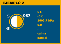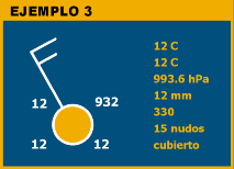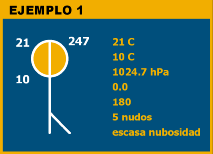 Figura 2. Modelo y ejemplos del resumen de observaciones meteorológicas en una carta sinóptica.
