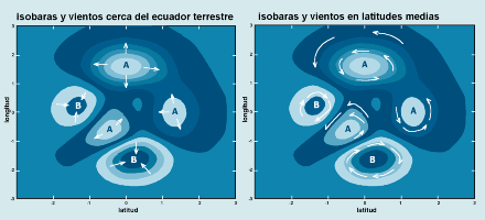 CARTAS DEL TIEMPO 3 El campo de presión y el campo de viento Recordemos que la presión atmosférica es una medida del peso de la columna de aire sobre el punto donde se realiza la medición. Es por eso que la presión siempre disminuye con la altura. Si se mide a nivel del mar, representa el peso de toda la atmósfera. La principal fuerza que activa el movimiento horizontal de la atmósfera se origina en las diferencias de presión (gradiente de presión). Esta fuerza apunta desde las zonas de alta presión a las regiones donde la presión es relativamente menor. Bajo este principio es esperable que el viento siempre apunte en la dirección de esta fuerza (en la dirección donde el gradiente de presión horizontal es máximo), en particular desde los anticiclones hacia las zonas de baja presión. El mismo principio se aplica en la vida cotidiana, cuando por ejemplo se pincha un neumático y el aire sale de la cámara que se encuentra inicialmente a mayor presión que el ambiente. Sin embargo, la rotación de la tierra modifica este esquema simple de movimiento horizontal, al generar una fuerza aparente (fuerza de Coriolis) que apunta hacia la izquierda de un observador colocado de espalda al viento el Hemisferio Sur, y hacia su derecha en el Hemisferio Norte. La combinación de los efectos de la fuerza de gradiente de presión y de la fuerza de Coriolis, explican el hecho en los movimientos de gran escala el aire, en lugar de desplazarse en la dirección del gradiente de presión, tienda a moverse a lo largo de las isóbaras, dejando la zona de alta presión a la izquierda (según la convención antes descrita) en el Hemisferio Sur, y a la derecha en el Hemisferio Norte. De todos modos, siempre existe una componente del viento que apunta en la dirección hacia donde la presión disminuye (Figura 3b). El efecto de desviación del viento por la fuerza de Coriolis es máximo en los Polos, disminuyendo progresivamente hacia el Ecuador donde es nulo. De este modo, un mapa de isobaras no solamente da información respecto a la dirección del viento, sino que también de su intensidad, que es proporcional al gradiente horizontal de la presión. La intensidad de este gradiente se refleja en el mapa sinóptico a través de una mayor o menor distancia entre las isobaras (mientras más cercanas mayor es el gradiente bárico).